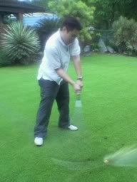 Playing golf in the garden omg.. Gma not happy, cuz we plucked her orange from her orange tree n played golf with it. >.<